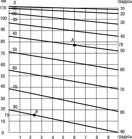 При определении местоположения необходимо помнить, что средняя длина дуги 1° географической широты составляет 111,12 км, длина 1’ составляет 1852,2 м. Длина одного градуса географической долготы зависит от широты места нахождения и может быть определена по номограмме 2 (рис. 2.9). Например, для широты 46° (точка А) протяженность дуги 1° равна 78 км, для широты 82°20’(точка В) – 15 км.