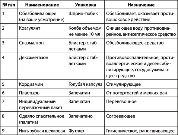 В аварийной аптечке должно быть только самое необходимое. Помимо жизненно важных лекарств индивидуального пользования, аптечку желательно укомплектовать препаратами или их аналогами, указанными в табл. 3.1.