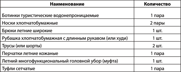 Таблица 3.2. Летняя одежда (ночная температура выше +16 °C)