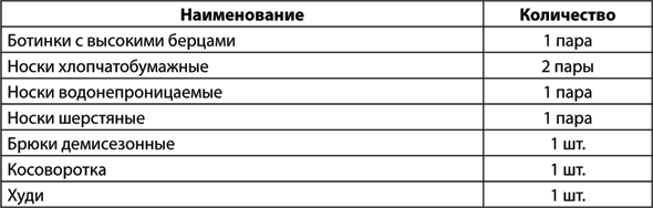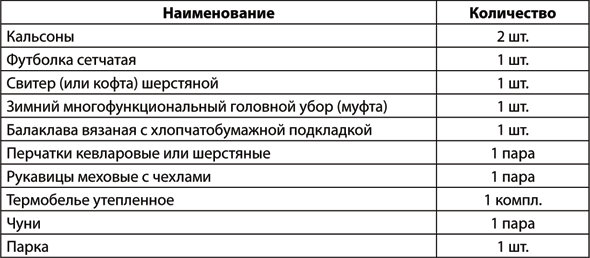 Таблица 3.4. Зимняя одежда (ночная температура ниже +4 °C)