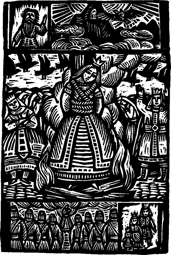 Судили королеву судьи и порешили сжечь ее на костре, как ведьму. Разожгли большой костер и повели ее, но тут хлынул дождь и залил огонь. Опять велели привезти сухого хворосту. И как раз миновало двенадцать лет — вот-вот прилетят братья. Только разожгли костер заново, глядь, летят черные вороны, опускаются наземь. Обернулся старший добрым молодцем и подвел за руку трехлетнего мальчика. Обернулся и второй добрым молодцем и принес двухлетнего мальчика, а за ними вышел и третий с новорожденным младенцем в пеленках. И все братья подбежали к костру и закричали: