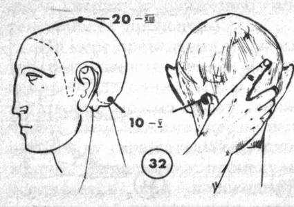 Точка 20—XIII (рис. 32) расположена в том месте, где линия, направленная вертикально вверх и соединяющая оба уха, достигает вершины головы и пересекается со средней линией головы на легко прощупываемом здесь шве между двумя теменными костями черепа. Если взять расстояние по средней линии головы от передней границы волосистой части головы до задней ее границы и разделить его на 12 частей, то расстояние от точки 20—XIII до передней границы будет равно 5/12 и до задней соответственно 7/12 частям этого расстояния.