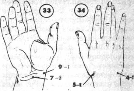 Точка 9—1 (см. рис. 33) расположена на ладонной поверхности руки, на границе ладони и предплечья у основания большого пальца в конце лучезапястной складки. Когда пальцы рук максимально разведены, в основании большого пальца четко проявляется толстое сухожилие. Точка 9—I расположена на этом сухожилии чуть в стороне от того места, где прощупывается пульс.