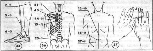 Точка 4—X (см. рис. 34) расположена на тыльной поверхности лучезапястного сустава, во впадине ближе к мизинцу, напротив четвертого пальца. Когда кисть руки разогнута (отведена в тыльную сторону), в этом месте легко прощупывается ямка.