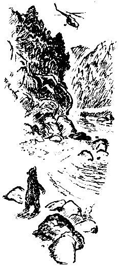 Между гор над долиной показался вертолёт. Услышав стрекот мотора, медведь встал на дыбы и стоял так, пока машина не пролетела. Потом опять принялся за прерванное занятие.