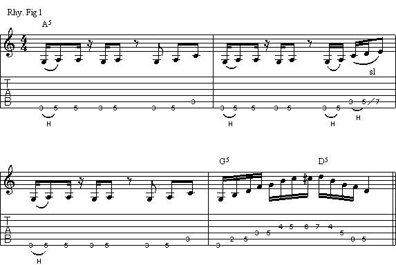 В первых 4-х тактах звучит ритмический рисунок 1. На записи он исполнен двумя гитарами, партии которых идентичны. Далее следует ритмический рисунок 2. Главное его отличие от предыдущего в том, что вторая гитара исполняет партию на октаву выше. Это касается только первых трех тактов. Далее, первая гитара исполняет аккорды, а вторая обыгрывает их. Затем идет соло, которое исполняется поверх ритмического рисунка 3.