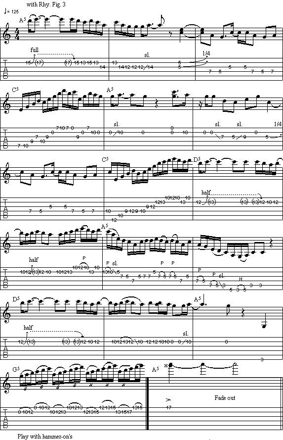 Гармония соло является следующей: A5-A5-A5-C5 (2 раза) — D5-D5-A5-A5-D5-D5-A5-G5. Практически на протяжении всего соло используется принцип ладовой относительности. Для обыгрывания аккорда A5 я использовал ля-минор (эолийский лад) и пентатонику, причем, здесь используются аппликатуры в твух позициях — с тоникой на 6-й и 5-й струнах.