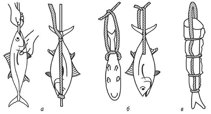 б – небольшую рыбу прошивают шпагатом возле хвоста;