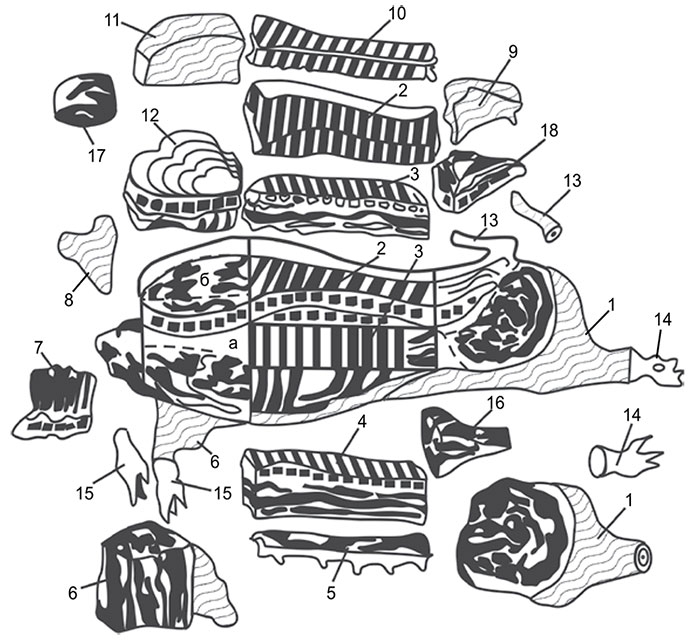 Рис. 3. Схема разделки свиной полутуши с незначительным отложением жира для посола и копчения: 1 – окорок; 2 – корейка; 3, 4 – грудинка; 5 – сосковая часть; 6 – лопатка; 7 – ребрышки; 8 – щечки; 9, 11 – шпик; 10 – позвонки; 12 – шейка; 13 – хвост; 14 – задние ножки; 15 – передние ножки; 16 – пашина; 17 – прирезь мяса с оставшейся в ней частью лопаточной кости и хрящом; 18 – хвостовые позвонки с прирезями мяса