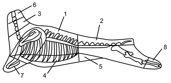 Рис. 5. Схема разрубки бараньей полутуши для посола: 1 – спинно-лопаточная часть; 2 – задняя часть; 3 – шея; 4 – грудинка; 5 – пашина; 6 – зарез; 7 – рулька; 8 – задняя голяшка