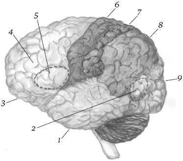 1 – височная доля; 2 – зона Вернике; 3 – лобная доля; 4 – префронтальная кора; 5 – зона Брока; 6 – моторная зона лобной доли; 7 – сенсорная зона теменной доли; 8 – теменная доля; 9 – затылочная доля