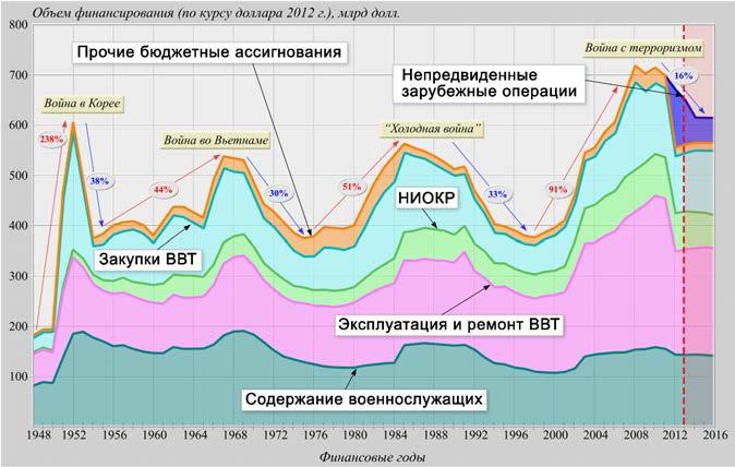 Примечание: до 2010 фин. года военные расходы на войну в Ираке и Афганистане финансировались в основном через законопроекты о дополнительных расходах (supplementary spending bills), начиная с 2010 фин. г. они были категорированы как «непредвиденные зарубежные операции» (НЗО) /Overseas Contingency Operations (ОСО) и включены в бюджет.