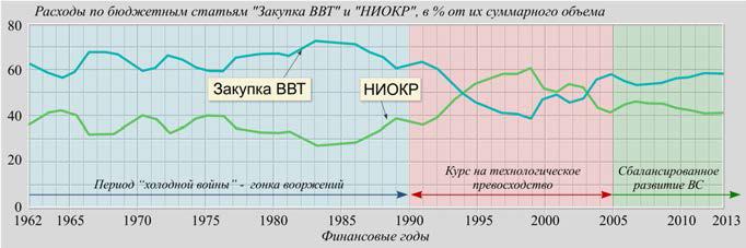 Рис. 1.4. Динамика изменения соотношения расходов по статьям военного бюджета «Закупки ВВТ» и «Проведение НИОКР»