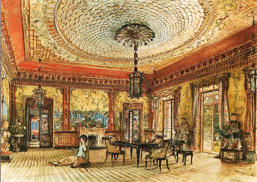 Большой зал салона наполнен светом от огромных французских окон, зелень просматривающегося через них парка перекликается с рисунком веток и птиц на бумажных обоях, ставших общей модой в эпоху бидермайера. Убранство выполнено в стиле шинуазри — причудливой смеси китайских, японских и турецких элементов. Потолок напоминает трельяжную решетку, в ее центре — огромный круг, поверхность которого имитирует рисунок рыбьей чешуи. Из пальметты в его середине спускается массивная цепь с расписанным фонарем. Большие керамические костюмированные фигуры, как и стенные вставки со сценами из жизни Китая, являются прямыми цитатами из китайских образцов, в то время как пол, застеленный коврами-дорожками, имитирующими соломенные циновки, черный мебельный лак, роспись дверей и спинки кресел из тростника привносят изысканный колорит японского жилища. Загадочная фигура, сидящая на полу, держит у лица маску — символ игры и обмана.