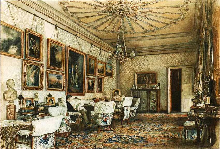 На представленной акварели изображен салон графа Кароля Ланкоронского в одной из его венских квартир. Потомок древнего польского дворянского рода, граф Ланкоронский принадлежал к богатейшей аристократической семье Австро-Венгрии, был потомственным членом палаты лордов в австрийском императорском совете, вице-президентом общества по охране культурного наследия Галиции, кавалером ордена Золотого руна и Мальтийского ордена, а также крупнейшим землевладельцем в Восточной Галиции, Польше и Штирии. Юрист по образованию, по призванию граф был историком искусств и слыл непревзойденным знатоком итальянского ренессанса. Путешествуя по Европе, Японии, Индии и Африки, он собрал огромную художественную коллекцию, которая считалась третьей по величине и ценности в Австро-Венгрии.