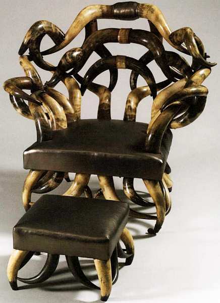 Представленный комплект из кресла и скамеечки для ног выполнен в мастерской Венцеля Фридриха — крупнейшего производителя мебели из рогов животных в США в XIX веке. Фридрих был чешским эмигрантом, в 1853 он переехал из Богемии в Сан-Антонио (штат Техас), где вскоре открыл собственное мебельное производство. Долгое время мастер придерживался общепринятых европейских тенденций, пока в 1880 не решил расширить свой бизнес, начав изготавливать предметы из рогов животных, прежде всего лонгхорна — породы английских коров, завезенных в США и быстро там распространившихся. Инициатива Фридриха имела блестящий результат, до него главным производителем мебели из рогов была Германия, где эта мода утвердилась с 1830-х. В Сан-Антонио же проживала очень крупная немецкая колония, и популярность мебели Фридриха стала стремительно расти.