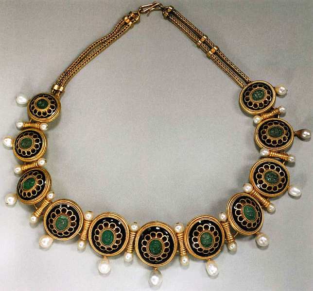 Представленные изделия — ожерелье с камеями и украшение для волос в форме кадуцея — выполнены в семейной мастерской Кастеллани, прославившейся работами, возрождавшими античную технику золотой филиграни и зерни. Свое небольшое ювелирное дело в Риме итальянский ювелир Пио Фортунато Кастеллани открыл в 1814. Огромное влияние на его произведения и стиль оказало открытие в 1830-х этрусских гробниц с великолепными древнеиталийскими украшениями. В результате Кастеллани стал первым ювелиром XIX века, посвятившим себя освоению чрезвычайно трудоемкой и сложной техники «грануляции» — этрусской филиграни, использовавшей тончайшую серебряную или золотую проволоку для создания замысловатого узора. Его увлечение древностью быстро переросло в настоящую страсть, Кастеллани вслед за этрусской филигранью занялся возрождением целого ряда античных ювелирных техник, чрезвычайно обогатив своими экспериментами европейское декоративное искусство. Неудивительно, что его изысканные и уникальные украшения, безусловно, относящиеся к классу самых «роскошных», имели огромный успех у современников и породили целую плеяду последователей и подражателей.