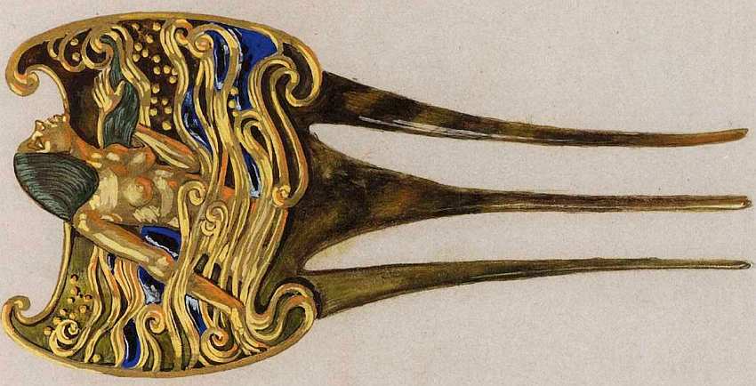 Перед зрителем — рисунок гребня изящной удлиненной волнистой формы, в верхней части украшенного композицией из золота и эмали, изображающей выныривающую из волн обнаженную нимфу.