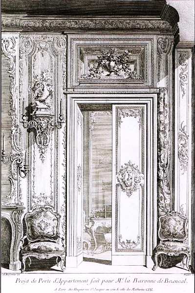 На представленной гравюре изображена характерная декорация интерьера и обстановка в стиле Людовика XV. Над высокой двустворчатой дверью — великолепный десюдепорт, в центре которого — наполненная цветами и листьями ваза. Стены украшают резные деревянные панели буазери. Два больших фигурных кресла на изгибающихся, танцующих ножках фланкируют дверь, через приоткрытую створку которой зритель видит такой же полный волнообразного движения столик. Фрагмент камина и роскошный настенный канделябр с птицей завершают эту изощренную, ювелирно отделанную интерьерную композицию.