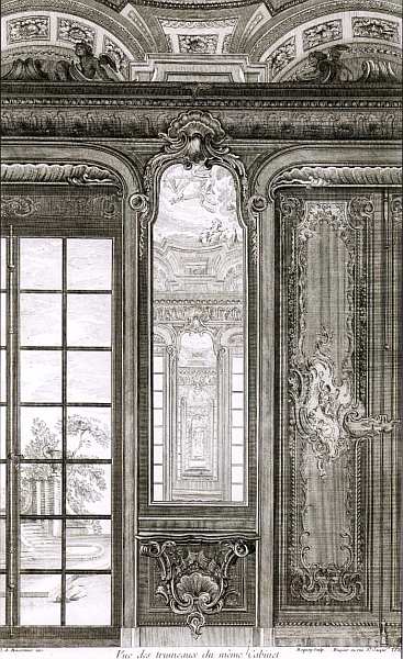 На представленной гравюре изображен фрагмент интерьера кабинета во дворце Белинского, разработанного Мейссонье. Зритель видит великолепное французское окно-дверь с частой расстекловкой, изящный консольный столик с мотивом раковины, узкую, длинную, также увенчанную большой раковиной зеркальную панель и виртуозно выполненную резную деревянную панель буазери с картушем-рокайлем посередине. Тяжелый лепной карниз и фрагменты иллюзионистической росписи потолка — наследие «версальского стиля», который еще долго оставался любимым во дворцах европейской знати.