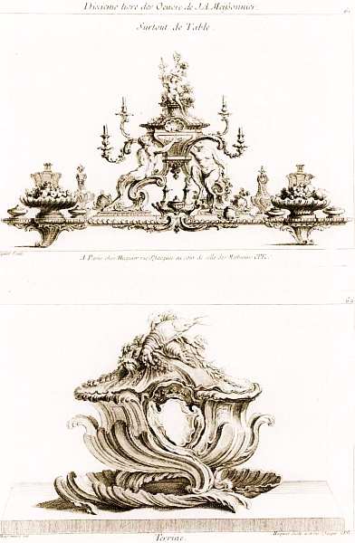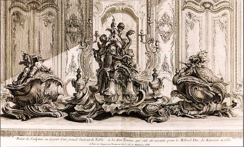 На представленной гравюре изображены основные фигуры сюрту де табль — большой центральной композиции парадного обеденного стола. Ее главный элемент — подставка для специй — оформлена как крупный, изгибающийся экспрессивными волнами картуш, на вершине которого в окружении раковин, листьев и виноградных гроздьев сидят путти. Две супницы по бокам подобны двигающимся живым существам или причудливым закрытым раковинам. На их крышках — крабы, лангусты, пучки салата и пряностей. Подставки, напоминающие большие капустные листья, причудливо выгибаются и закручиваются в спирали. Все элементы композиции словно колеблются от дуновения ветра или течения воды.