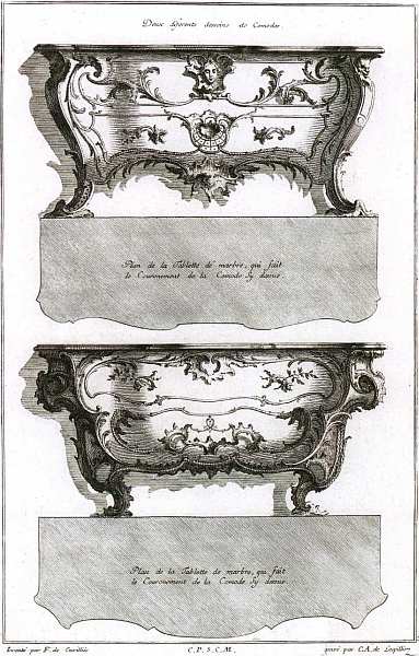 Представленные эскизы комодов являются фрагментами более поздней серии гравюр Кювилье с образцами мебели. Верхний рисунок обыгрывает мотивы ренессансного гротеска — в центре маска ангела в окружении извивающихся, как виноградные стебли, завитков, в углах — маски дьявола. Второй комод украшен лишь завитками рокайля.