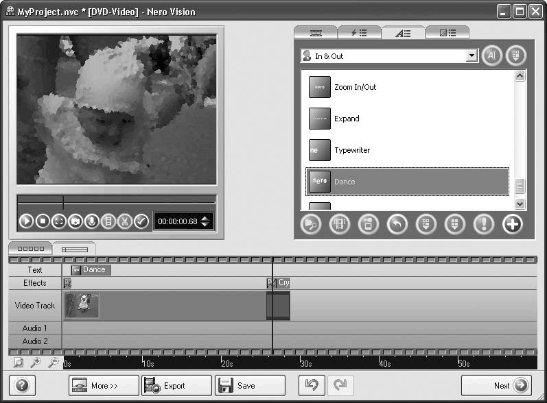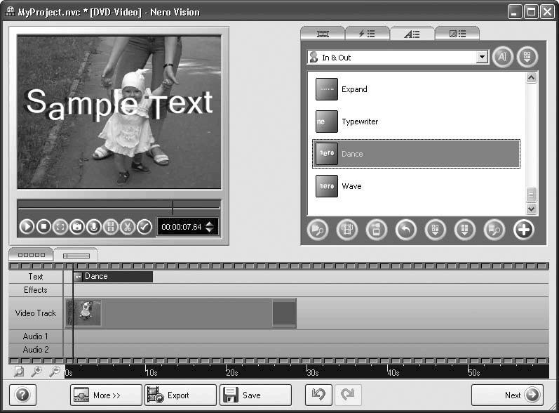1. Откройте в окне Asset View (Вид активов) вкладку Display Text Effects (Показать текст. эффекты), прокрутите список вниз, пока не увидите пункт Dance (Танец). Перетащите его с помощью мыши на дорожку Text (Текст) редактора (рис. 7.6).