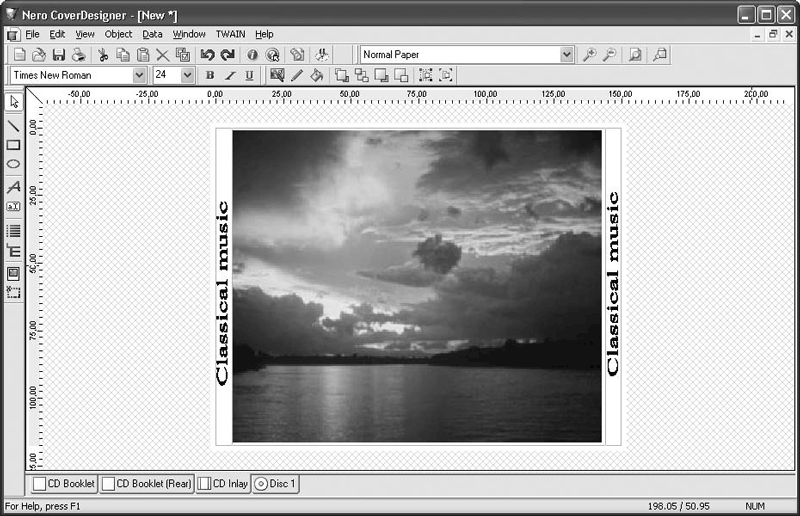 15. Редактирование этой части вкладыша заключается в создании на боковых загибающихся полях надписей с названием диска. Механизм поворота надписи был рассмотрен ранее. Воспользуйтесь рекомендациями и сделайте надписи на боковых сторонах вкладыша. Вставьте рисунок при помощи кнопки Image Tool (Изображение). В результате получится вкладыш с надписями на боковых поверхностях (рис. 9.9).