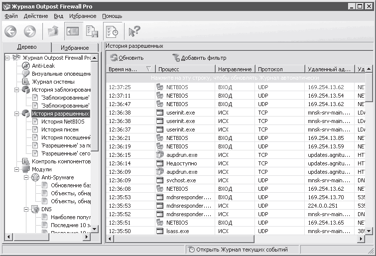 Рис. 3.44. Журнал Outpost Firewall