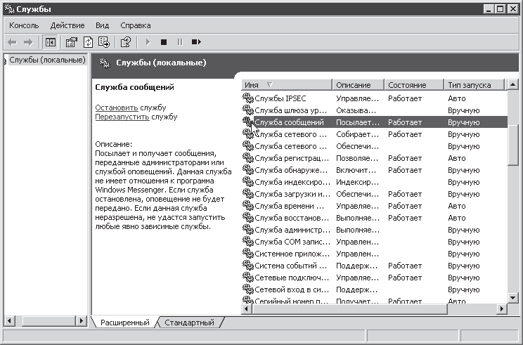 Отключить службу сообщений Windows можно без использования xp-AntiSpy. Для этого на Панели управления щелкните на пункте Администрирование, а затем – на значке Службы. Откроется окно, в котором будут представлены все запущенные службы Windows. В этом списке найдите строку Служба сообщений (рис. 3.50), щелкните на ней правой кнопкой мыши и выберите в контекстном меню строку Свойства. В списке Тип запуска вкладки Общие появившегося окна выберите значение Отключено. Чтобы остановить работу службы, нажмите кнопку Стоп.
