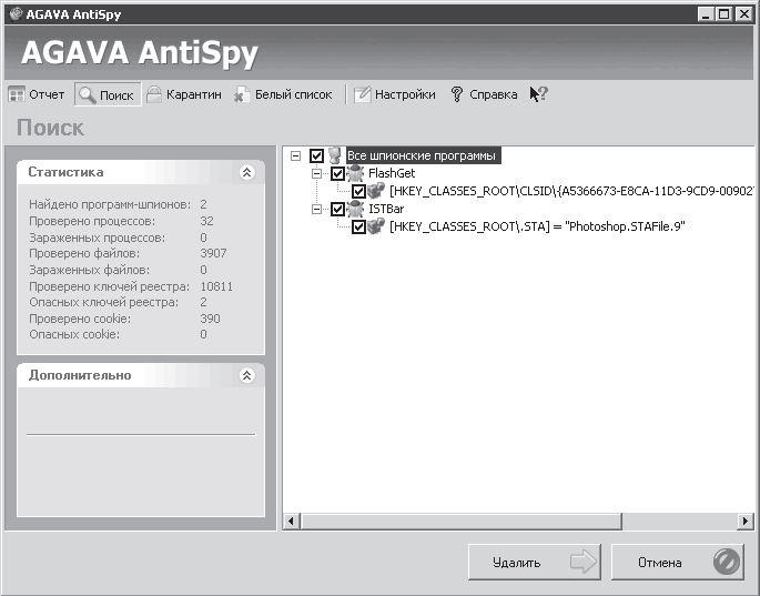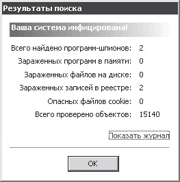 Программа AGAVA AntiSpy позволяет найти и обезвредить все шпионские программы, которые находятся на компьютере. Приложение сканирует все области, где могут скрываться шпионы, в том числе системный реестр, запущенные процессы, папки, где обычно располагаются такие программы. После завершения сканирования выводится сообщение о количестве найденных вредоносных модулей, зараженных файлов, опасных записей в реестре и пр. (рис. 3.51).
