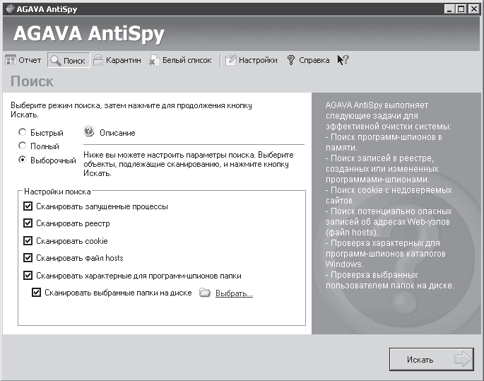 AGAVA AntiSpy следит за безопасностью компьютера в автоматическом режиме. Программа запускается вместе со стартом Windows и сразу же выполняет полное сканирование всех потенциально опасных областей системы. Эти параметры можно изменить в настройках программы. Здесь также можно задать параметры поиска, например исключить из поиска шпионских модулей какие-либо папки, реестр или другие области (рис. 3.53). В большинстве случаев это не нужно, так как даже в режиме полного поиска по всем областям AGAVA AntiSpy работает очень быстро – проверка вряд ли займет более пяти минут.