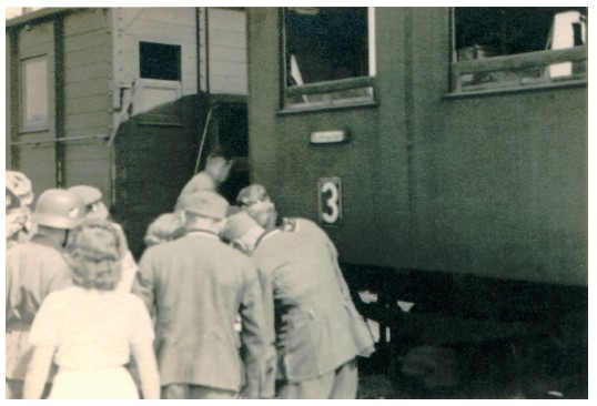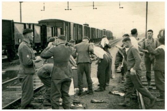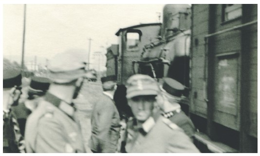 Гауптманн Залмингер с оберлейтенантом Артманом беседуют со словацким железнодорожным персоналом