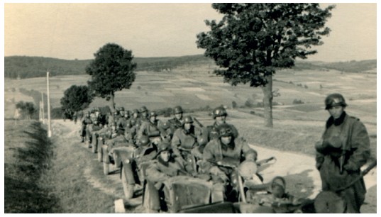 По приказу командира батальона я оставил свой взвод егерей и получил под командование мотоциклетный взвод. Все мотоциклы комплектовались водителем и стрелком, который ехал в коляске (на роль стрелка из каждой роты было выделено по унтер-офицеру).