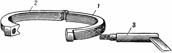 1 — правая часть хомута; 2 — левая часть хомута; 3 — стяжной болт хомута с рукояткой горизонтального зажима
