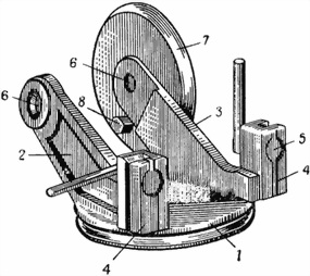1 — диск; 2 — правый кронштейн; 3 — левый кронштейн; 4 — выступы с вертикальными пазами; 5 — завертки щита; 6 — отверстия для оси качающейся части; 7 — дисковый выступ; 8 — упор