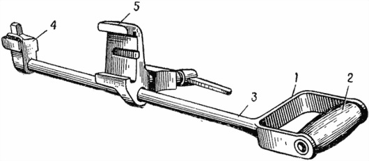 1 — скоба; 2 — деревянная ручка; 3 — стержень; 4 — крючок с направляющим выступом; 5 — ползун