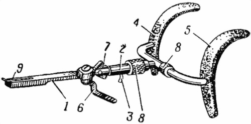 1 — основание; 2 — трубка с вилкой; 3 — задний конец защелка трубки; 4 — правый плечевой упор; 5 — левый плечевой упор; 6 — зажим основания; 7 — зубчатый сектор; 8 — зажимная муфта; 9 — защелка основания