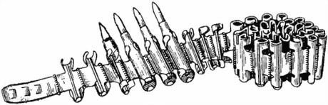 Каждое звено ленты снабжено двумя парами пружинящих рожек для удержания патрона от выпадания и упором для придания правильного положения патрону в ленте.