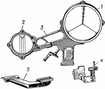 191. Промежуточный кронштейн (рис. 96) служит для уменьшения длины прицельной линии до 340 мм при креплении прицела на пулемете обр. 1938 г. Он имеет паз для соединения с хомутом и выступ в виде ласточкина хвоста с воротком для соединения с передним визиром.