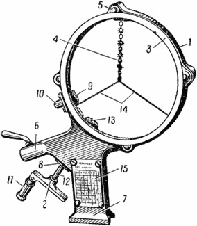 190. Хомут (рис. 95) служит для крепления зенитного прицела на пулемете обр. 1938 г. Хомут имеет верхнюю часть «ласточкин хвост» с воротком для промежуточного кронштейна, нижнюю часть, соединенную с верхней с помощью оси, и откидной болт с осью и гайкой для закрепления хомута на пулемете.