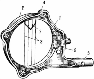 1 — передний визир; 2 — задний визир; 3 — хомут; 4 — курсовой визир; 5 — промежуточный кронштейн; 6 — валик; 7 — ключи