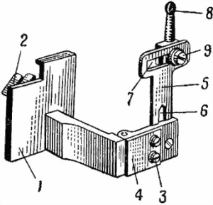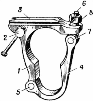 1 — верхняя часть; 2 — вороток; 3 — ласточкин хвост; 4 — нижняя часть; 5 — ось; 6 — откидной болт; 7 — ось болта; 8 — гайка