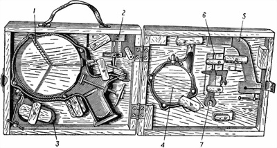 218. Передний кольцевой визир (рис. 102) состоит из кольцевого визира, стойки с вилкой и груза-отвеса.