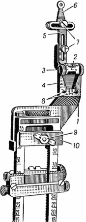 220. Верхний кронштейн крепит линейку и имеющиеся на ней части к нижнему кронштейну-седлу при помощи барашка и винта, которые ввинчиваются в навинтованные гнезда верхнего кронштейна.