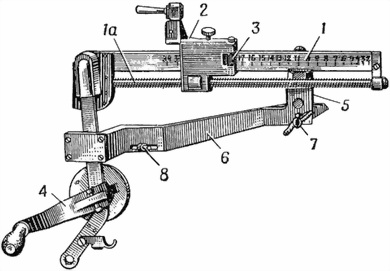 К головке тяги крепятся задний подшипник ходового винта, обойма и кожух подшипника, образующий коробку для нижней пары конических шестерен (большой и малой). Тяга удерживается на пальце оси качающейся части станка крючком.