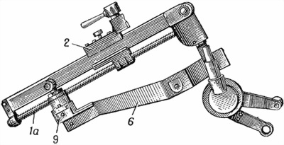 1 — дистанционная линейка; 2 — опорный винт; 3 — зубчатая рейка; 4 — ограничивающий винт; 5 — каретка; 6 — маховикчок с шестерней; 7 — регулировочный винт; 8 — держатель; 9 — указатель; 10 — стойка с основанием
