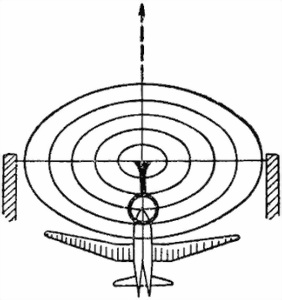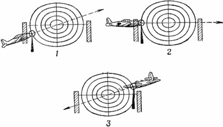 Рис. 126. Выбор точки визирования при ведении огня завесами. Самолет идет к курсовому параметру. Кольцевой визир поставлен горизонтально