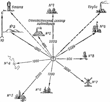 342. Дальность до цели определять при помощи универсальной лиры, по местным предметам (ориентирам) или на глаз. Дальность командовать в делениях прицела с округлением до 100 м.