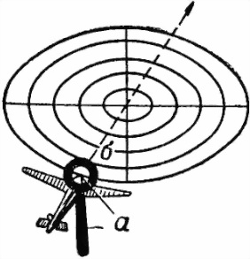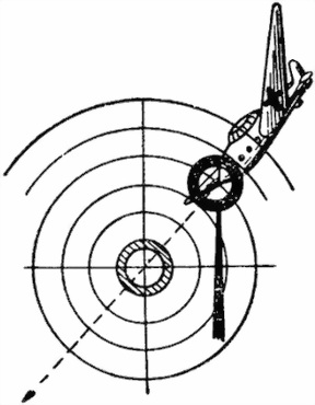358. Стрельба по парашютистам и светящимся авиабомбам ведется с зенитным прицелом. Точку визирования выбирать на наружной поверхности втулки кольцевого визира так, чтобы прямолинейный путь опускающегося парашютиста (вертикальный или наклонный), продолженный от точки визирования на втулку, проходил через центр втулки. Кольцевой визир ставить вертикально (по отвесу) (рис. 132).